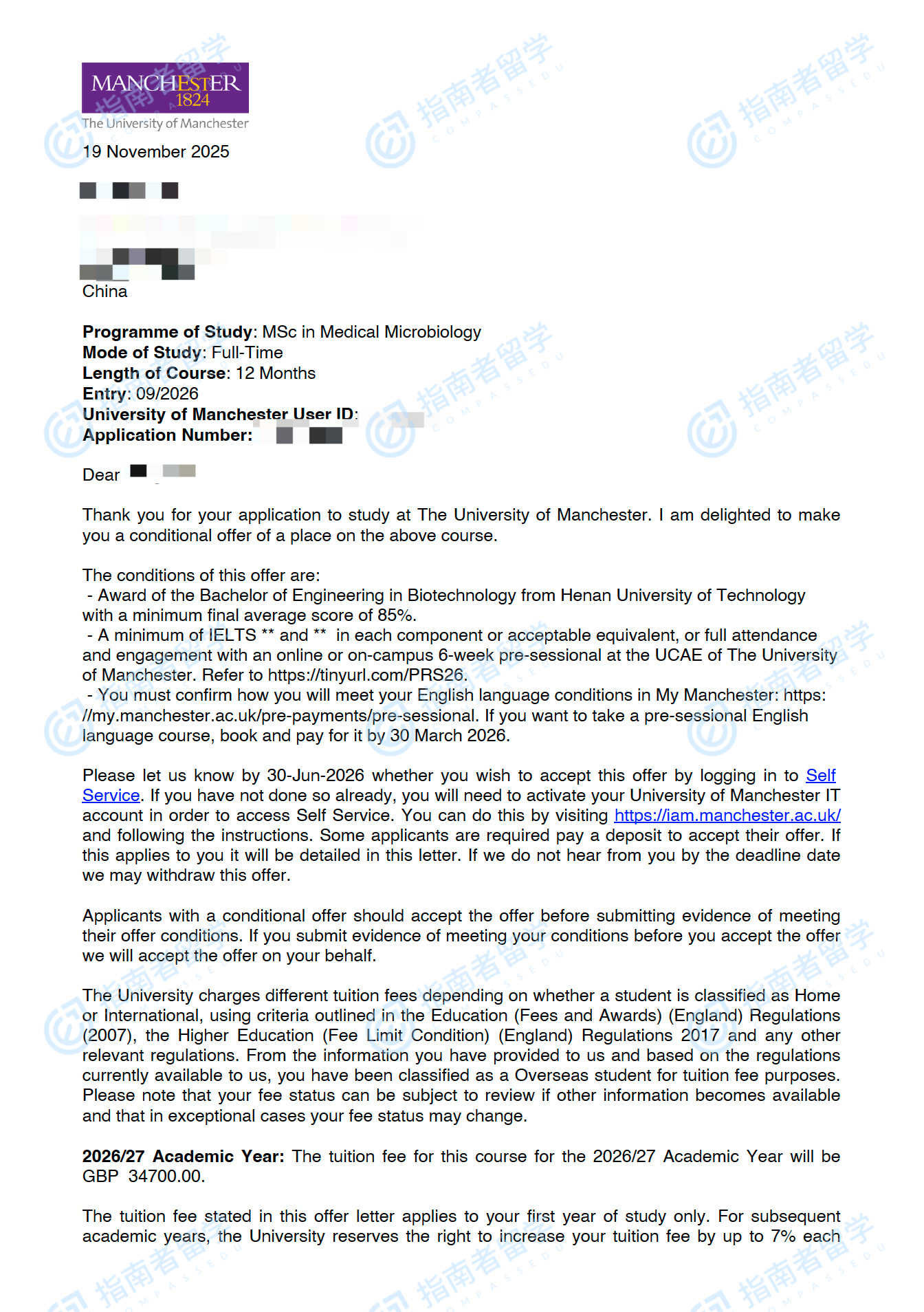 曼徹斯特大學(xué)醫(yī)學(xué)微生物學(xué)理學(xué)碩士研究生offer一枚