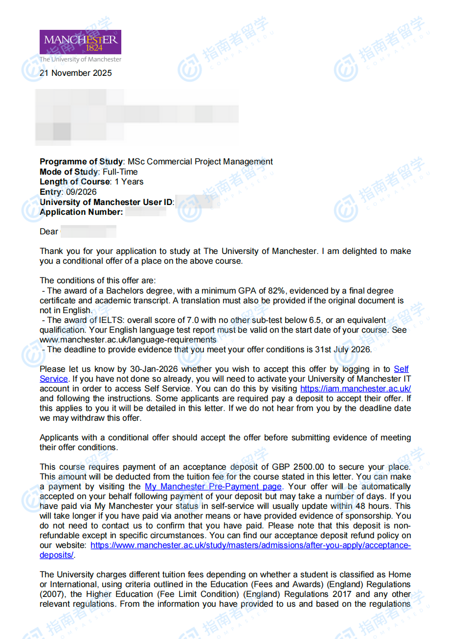 曼徹斯特大學(xué)商業(yè)項目管理理學(xué)碩士研究生offer一枚
