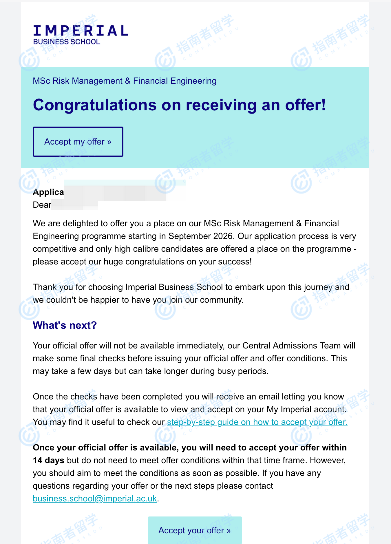 帝國(guó)理工學(xué)院風(fēng)險(xiǎn)管理與金融工程理學(xué)碩士研究生offer一枚