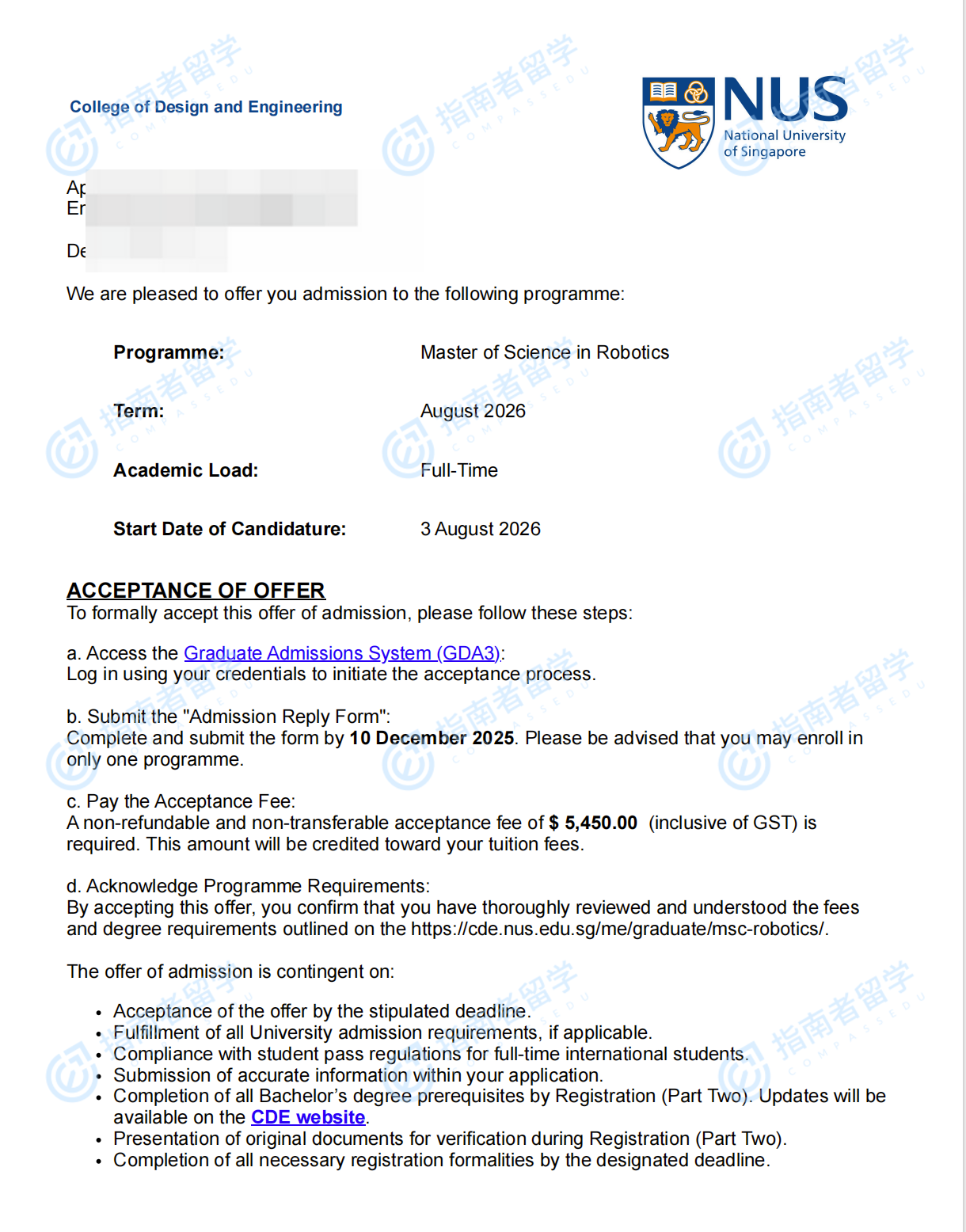 新加坡國立大學機器人學理學碩士研究生offer一枚