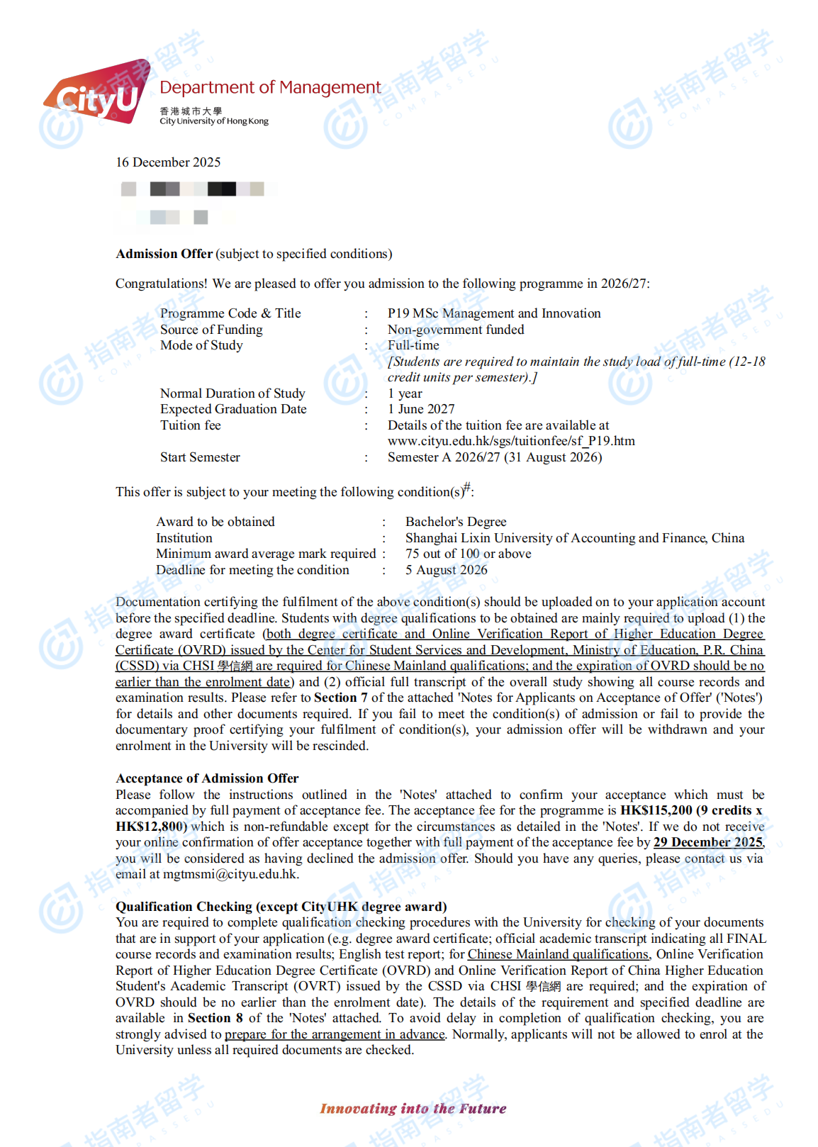 香港城市大學管理與創(chuàng)新理學碩士研究生offer一枚