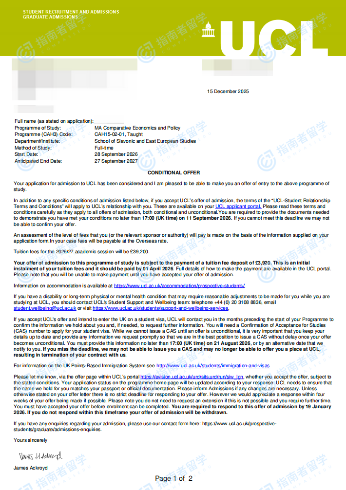 倫敦大學學院比較經(jīng)濟學與政策文學碩士研究生offer一枚