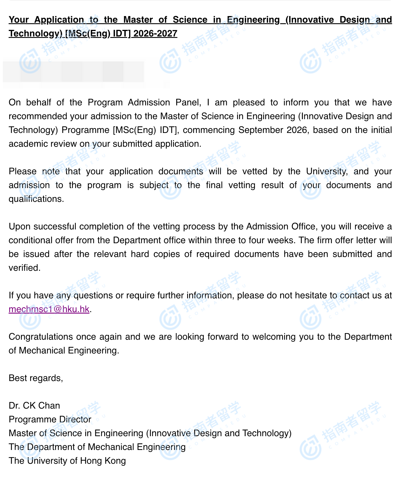 香港大學創(chuàng)新設計與科技(工程)理學碩士研究生offer一枚