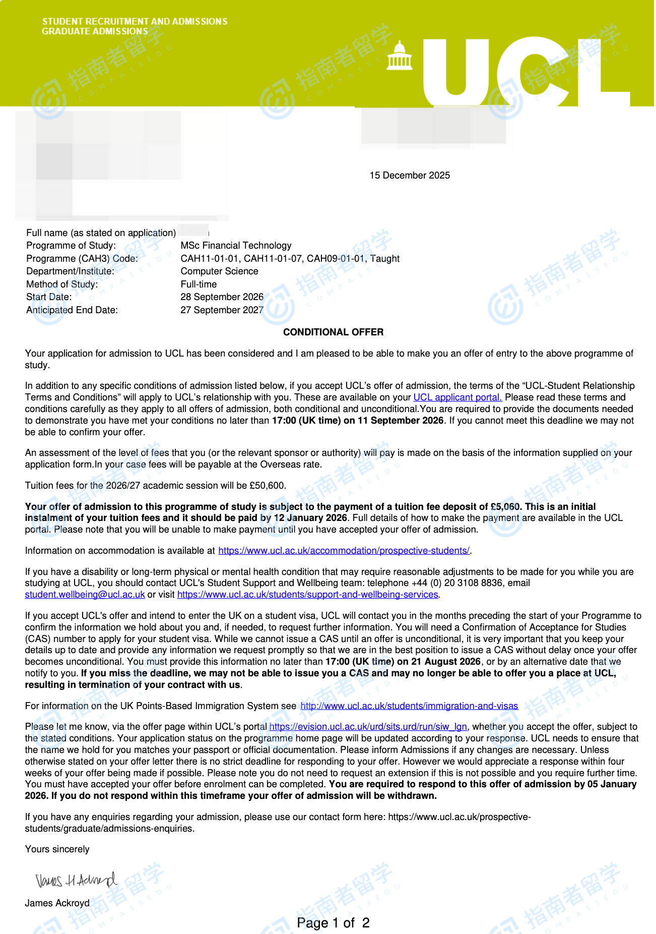 倫敦大學(xué)學(xué)院金融科技理學(xué)碩士研究生offer一枚