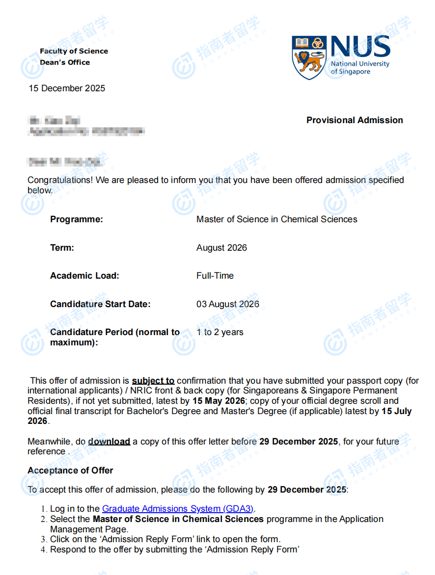 新加坡國立大學(xué)化學(xué)科學(xué)理學(xué)碩士研究生offer一枚