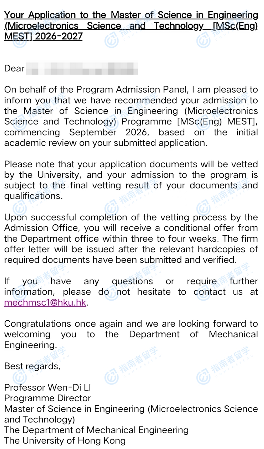 香港大學(xué)微電子科學(xué)與技術(shù)(工程)理學(xué)碩士研究生offer一枚