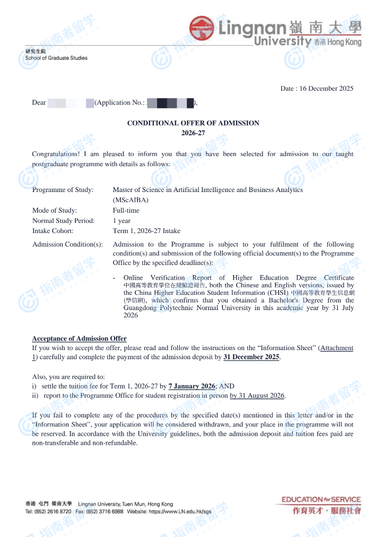 香港嶺南大學人工智能與商業(yè)分析理學碩士研究生offer一枚