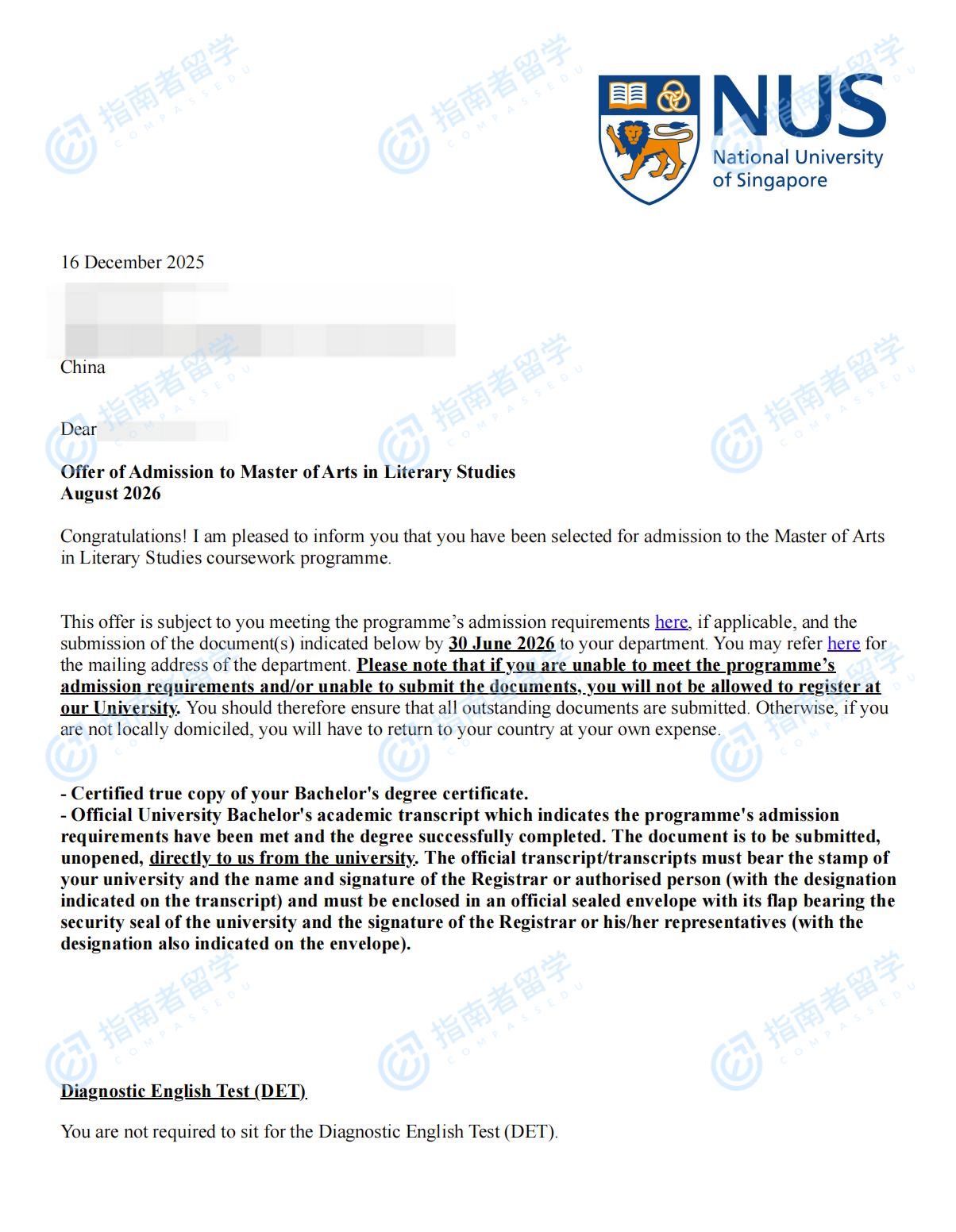 新加坡國(guó)立大學(xué)文學(xué)研究文學(xué)碩士研究生offer一枚