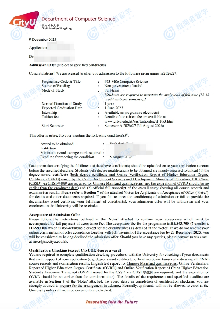 香港城市大學(xué)計(jì)算機(jī)科學(xué)理學(xué)碩士研究生offer一枚