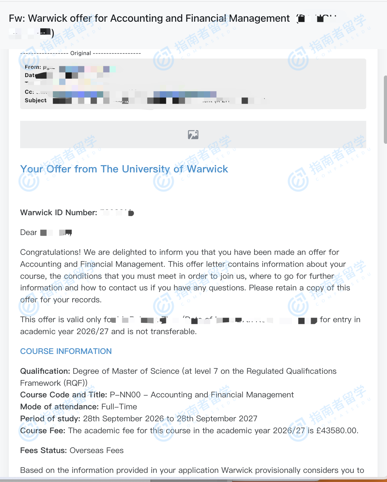 華威大學會計與財務管理理學碩士研究生offer一枚