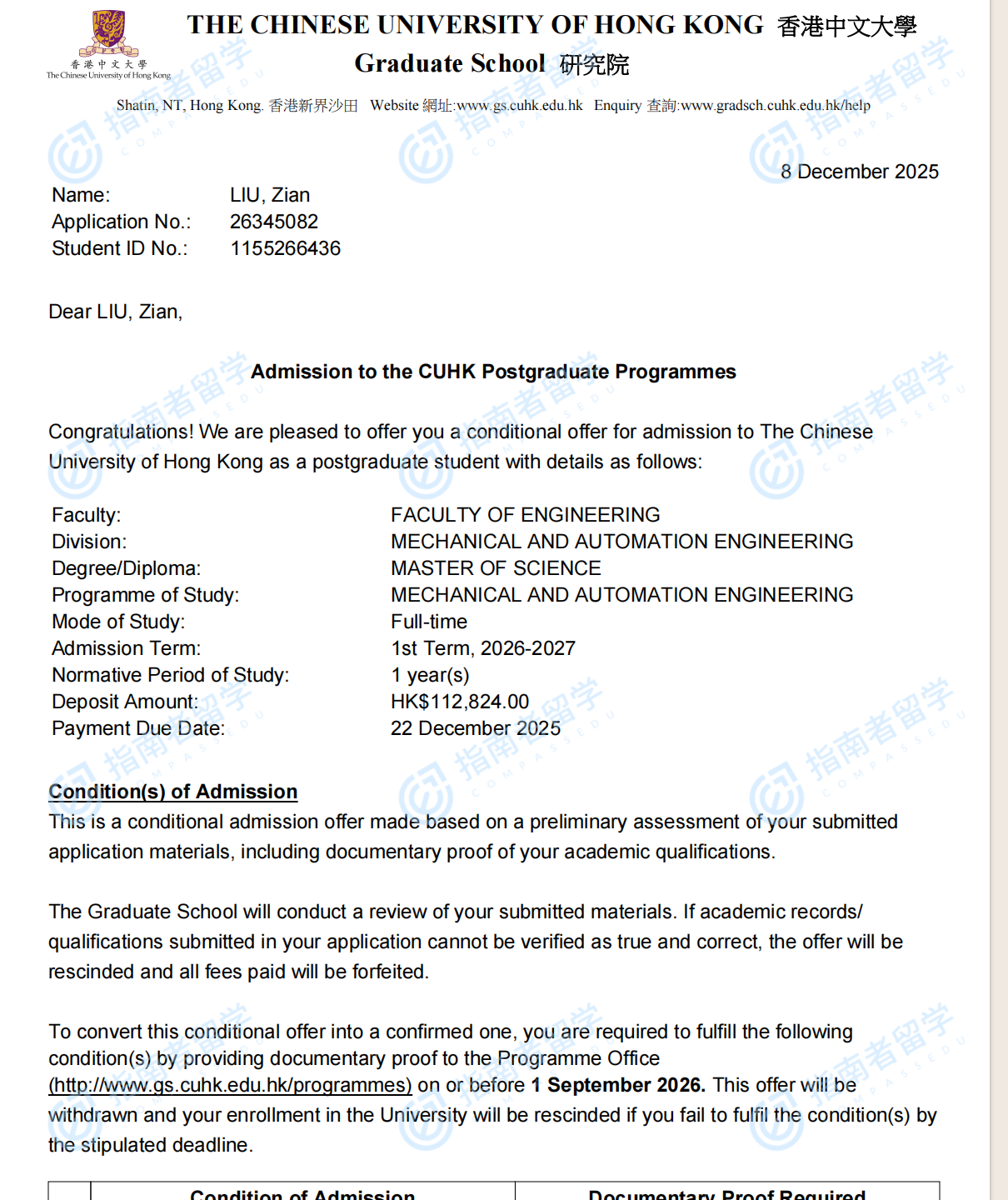 香港中文大學(xué)機(jī)械與自動(dòng)化工程理學(xué)碩士研究生offer一枚