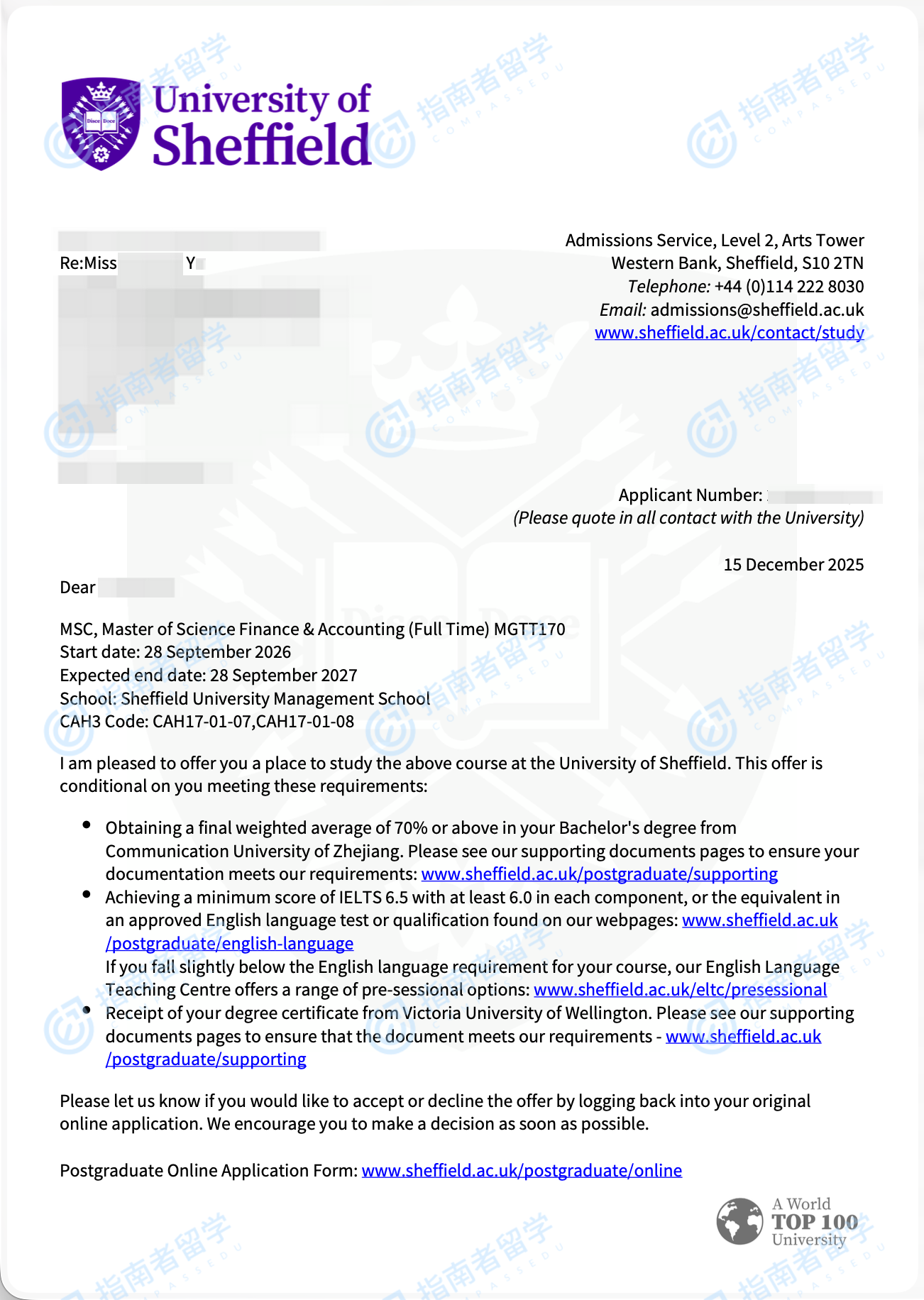 謝菲爾德大學(xué)金融與會計(jì)理學(xué)碩士研究生offer一枚