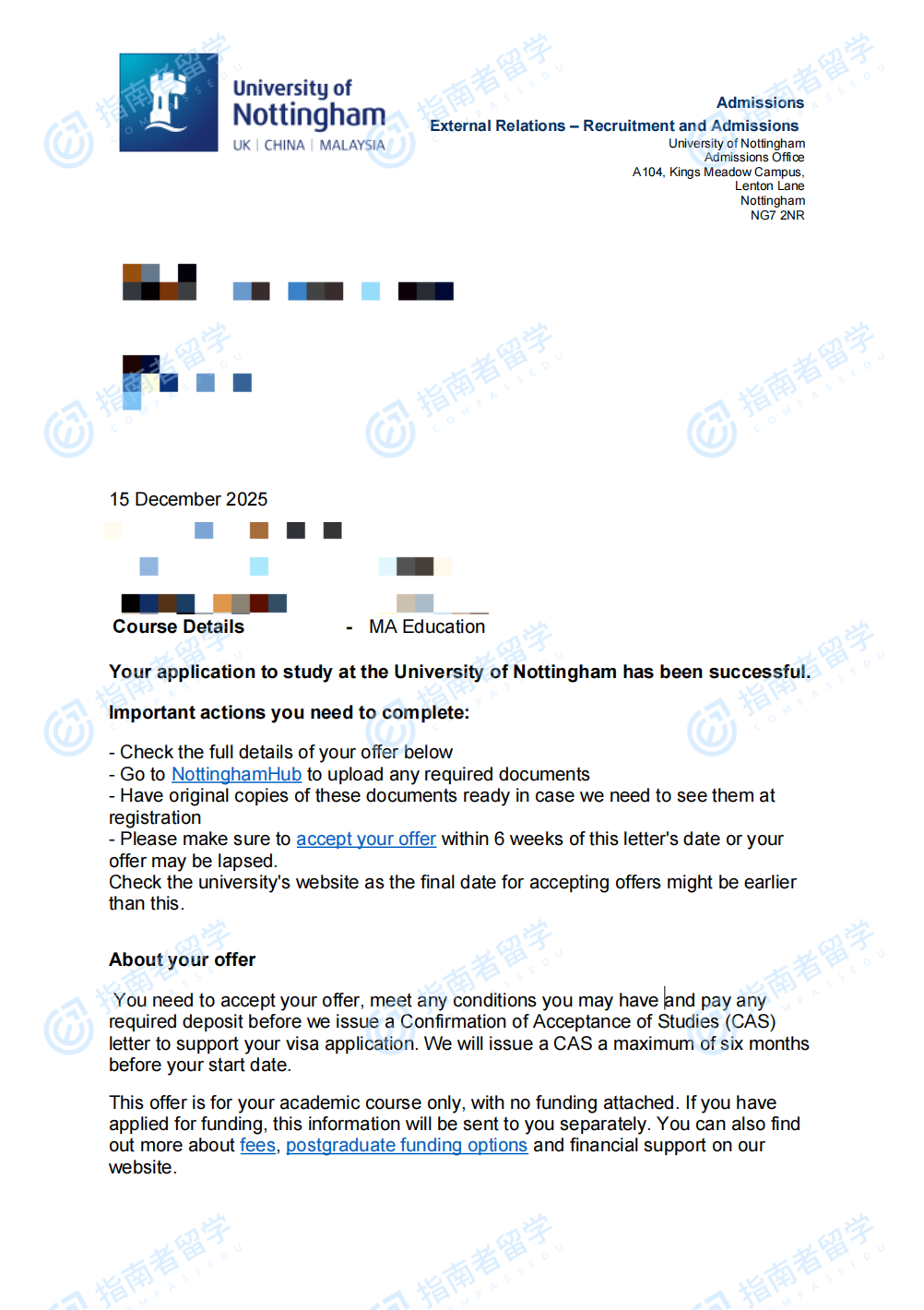 諾丁漢大學(xué)教育學(xué)文學(xué)碩士研究生offer一枚