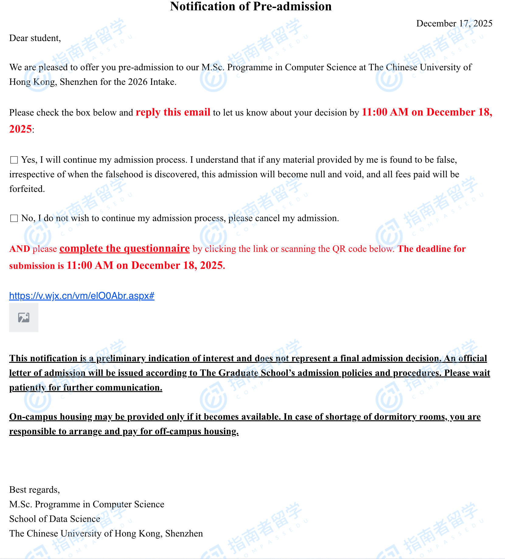 香港中文大學計算機科學理學碩士(CUHK-Shenzhen)研究生offer一枚