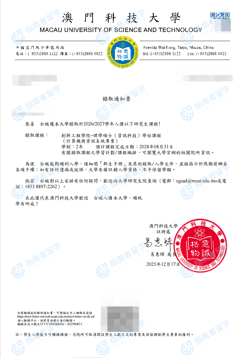 澳門科技大學(xué)資訊科技理學(xué)碩士研究生offer一枚
