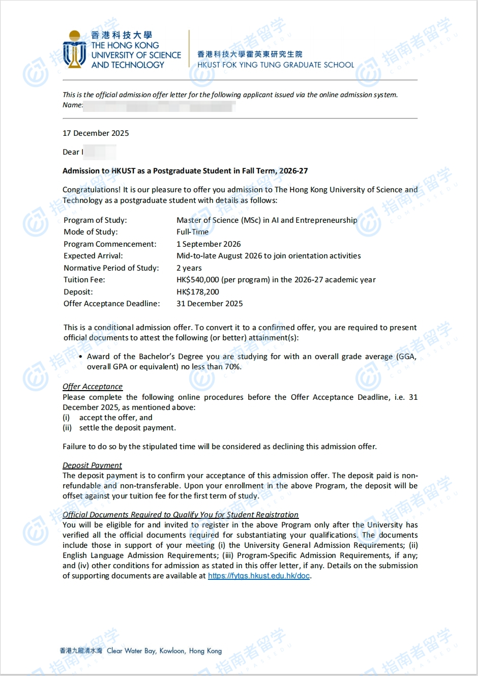 香港科技大學(xué)人工智能與創(chuàng)業(yè)理學(xué)碩士研究生offer一枚