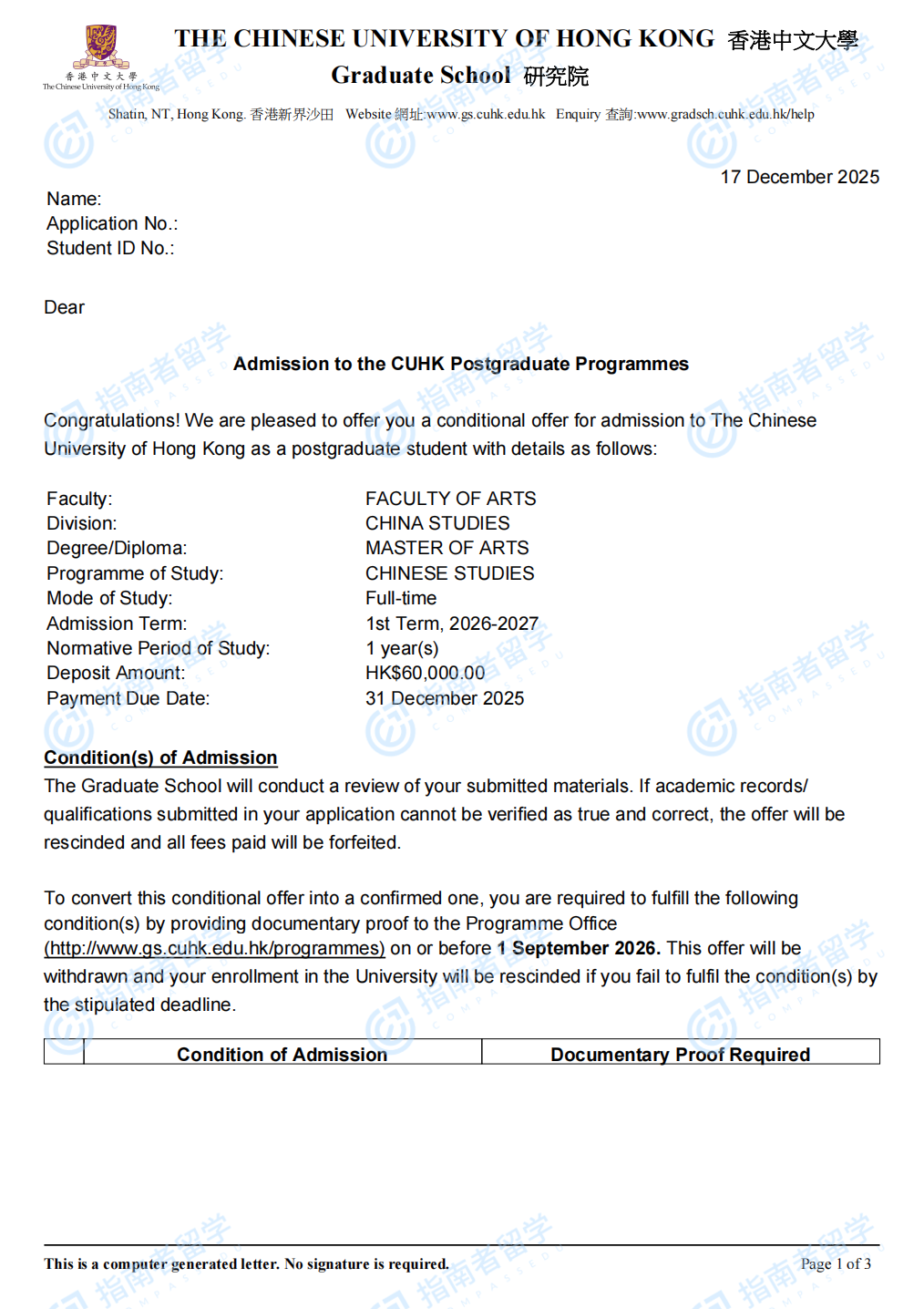 香港中文大學(xué)中國(guó)研究文學(xué)碩士研究生offer一枚