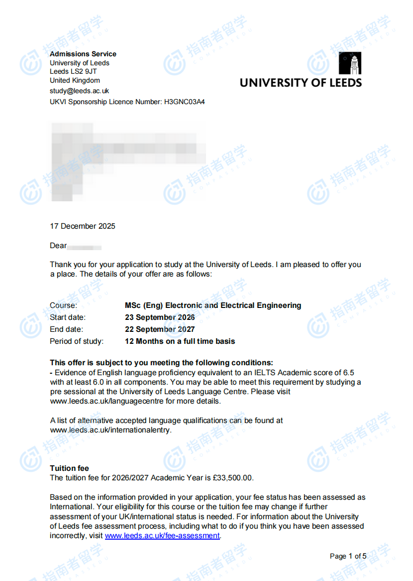 利茲大學電子與電氣工程(工程)理學碩士研究生offer一枚