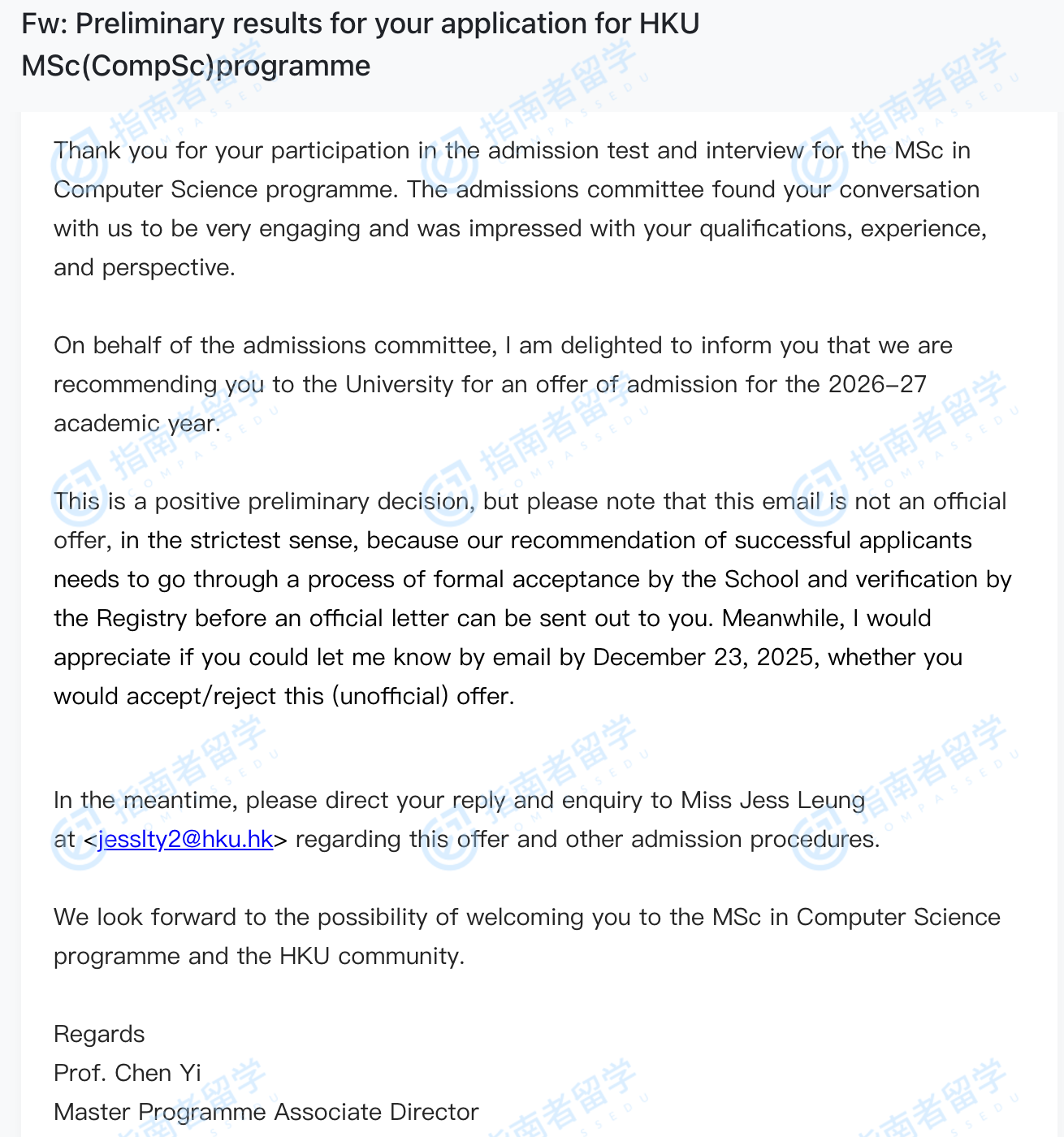 香港大學(xué)計(jì)算機(jī)科學(xué)理學(xué)碩士(常規(guī)方向)研究生offer一枚