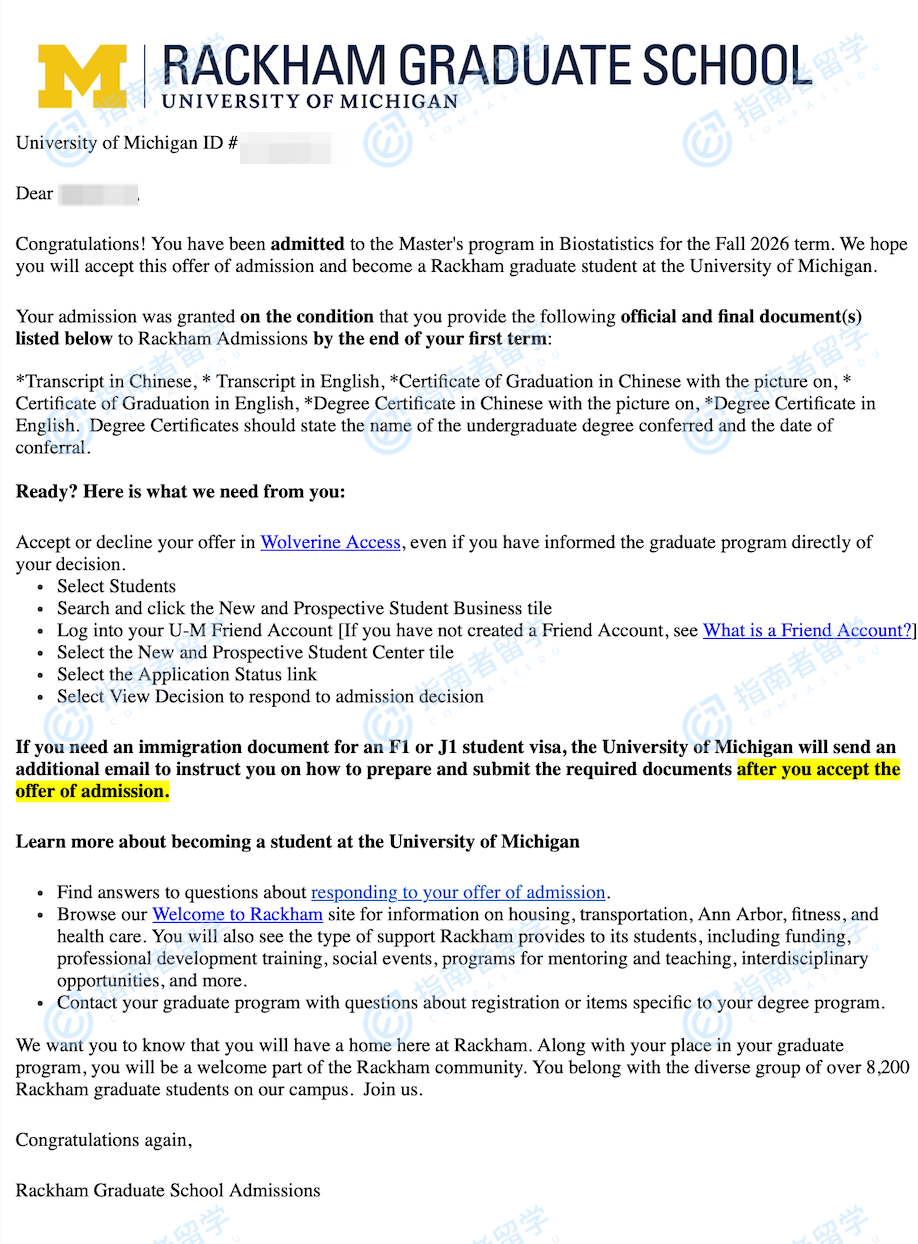 密歇根大學(xué)安娜堡分校生物統(tǒng)計(jì)學(xué)理學(xué)碩士研究生offer一枚