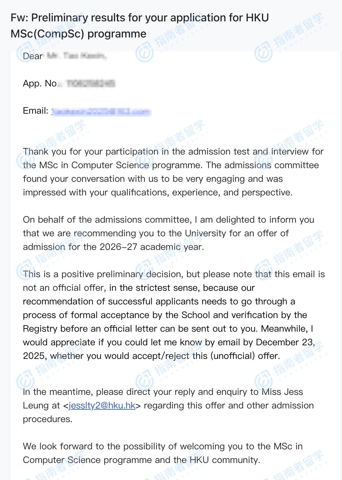 香港大學(xué)計(jì)算機(jī)科學(xué)理學(xué)碩士(常規(guī)方向)研究生offer一枚